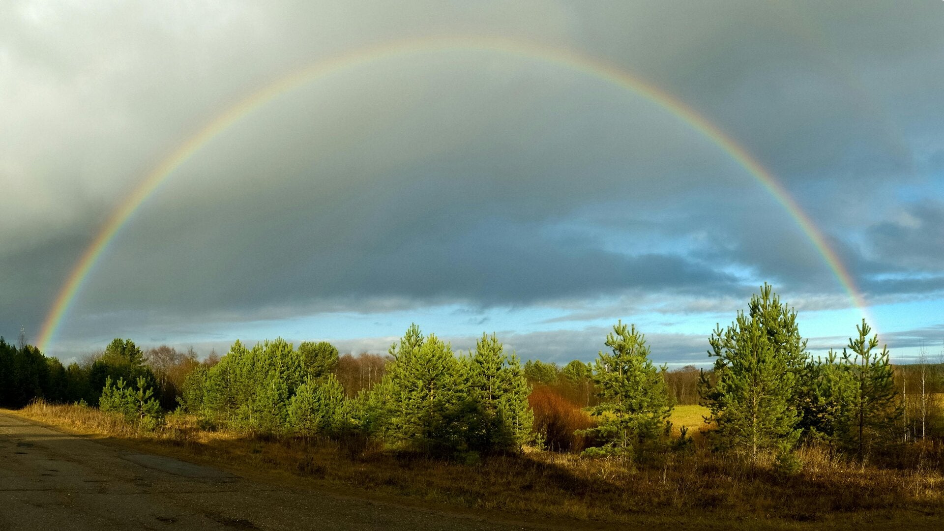VISUALISATIE: Regenboog boven een rustig landschap.